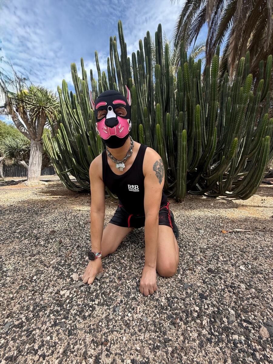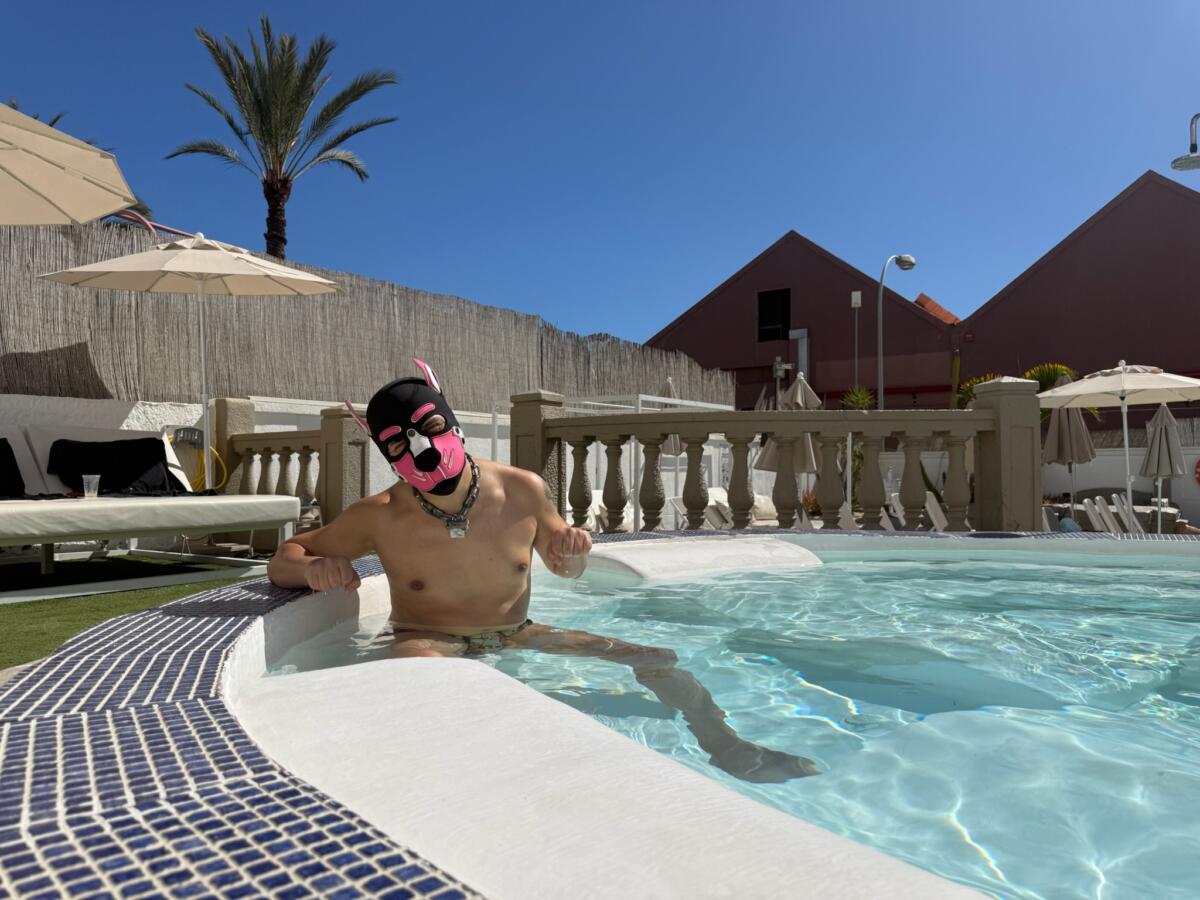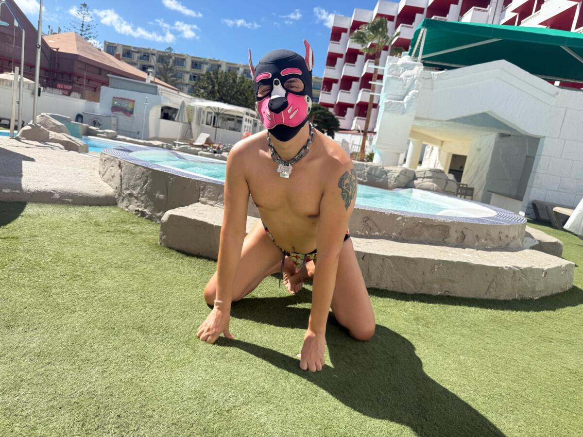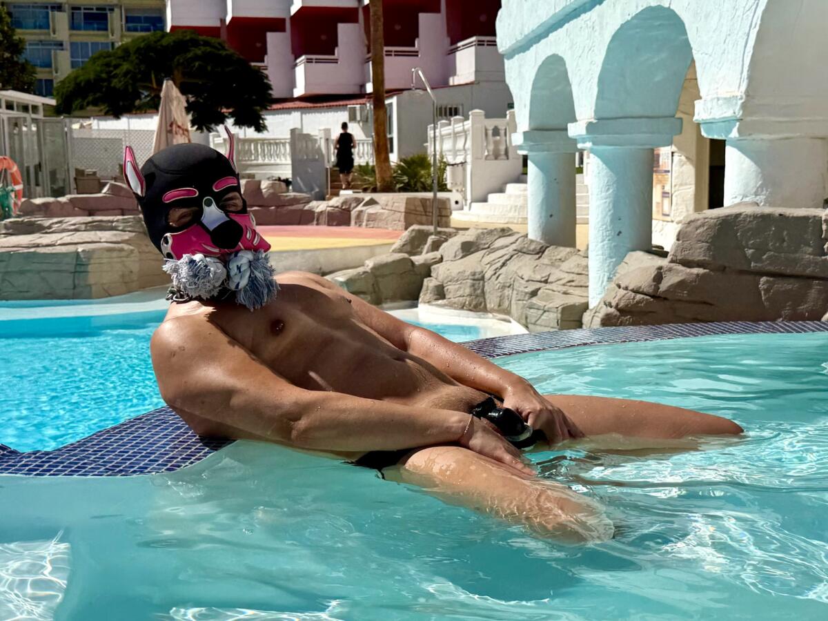 Öslav s’éclate dans sa piscine. Sans pudeur, à la plage ou au pied des balcons de l’hôtel Ritual à Maspalomas. Öslav vit sa vie. Puppy… et esclave. Son moment préféré, le cafe con leche (de son maître).